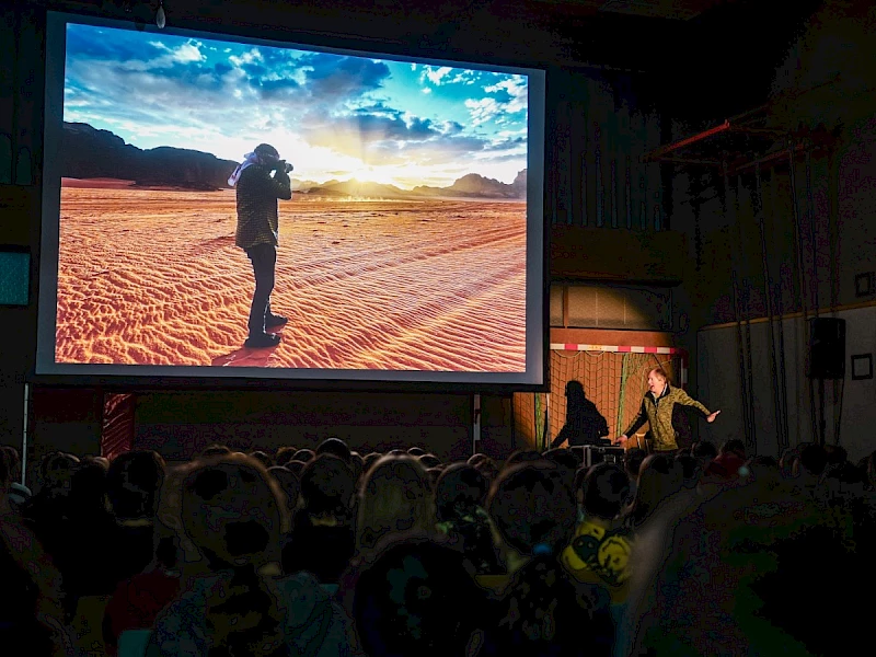 Heute fand in der Turnhalle ein beeindruckender Geografie-Vortrag von Helmut Pichler statt. Er berichtete von seiner Reise in den Orient und präsentierte faszinierende Bilder aus verschiedenen Ländern. Besonders beeindruckend waren die Aufnahmen aus Jordanien, mit der Felsenstadt Petra, und aus Saudi-Arabien. Auch China und Japan kamen nicht zu kurz, wo er die einzigartige Mischung aus Tradition und Moderne festhielt. Neben den Städten und der Natur standen auch die Tiere der bereisten Regionen im Fokus. Sein Vortrag weckte bei den Zuhörern die Reiselust und vermittelte einen spannenden Einblick in fremde Kulturen.