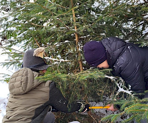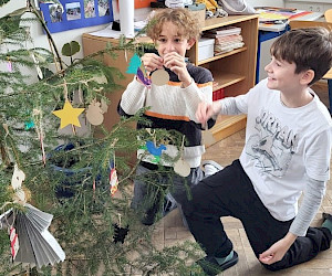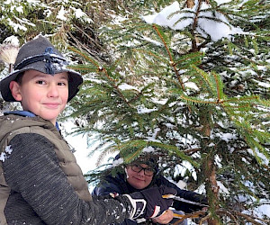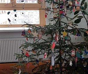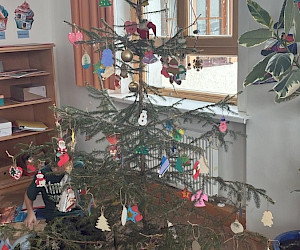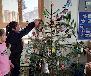 Die Schüler waren mit Begeisterung auf der Suche und fanden auch einen passenden Baum, den sie voller Stolz aus dem Wald transportierten. In der Schule wurde der Baum mit viel Freude weihnachtlich geschmückt.