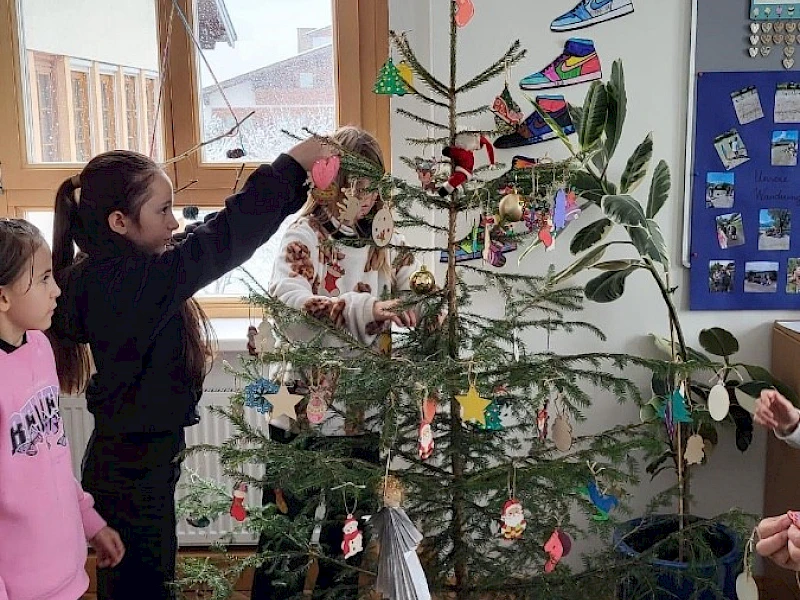 Die Schüler waren mit Begeisterung auf der Suche und fanden auch einen passenden Baum, den sie voller Stolz aus dem Wald transportierten. In der Schule wurde der Baum mit viel Freude weihnachtlich geschmückt.